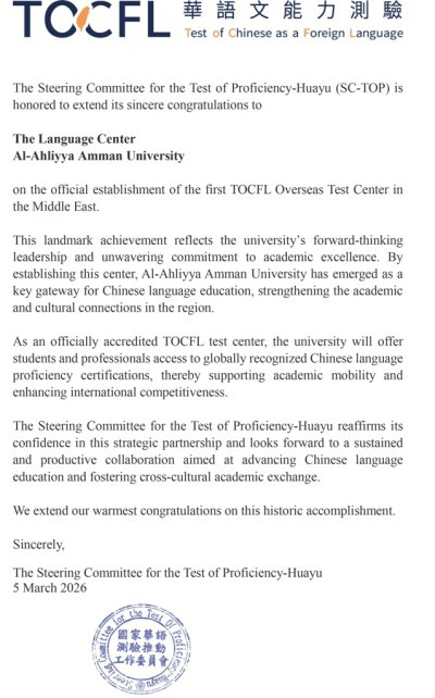 عمّان الأهلية تُعتمد كأول مركز دولي لاختبار TOCFL للغة الصينية في الشرق الأوسط
