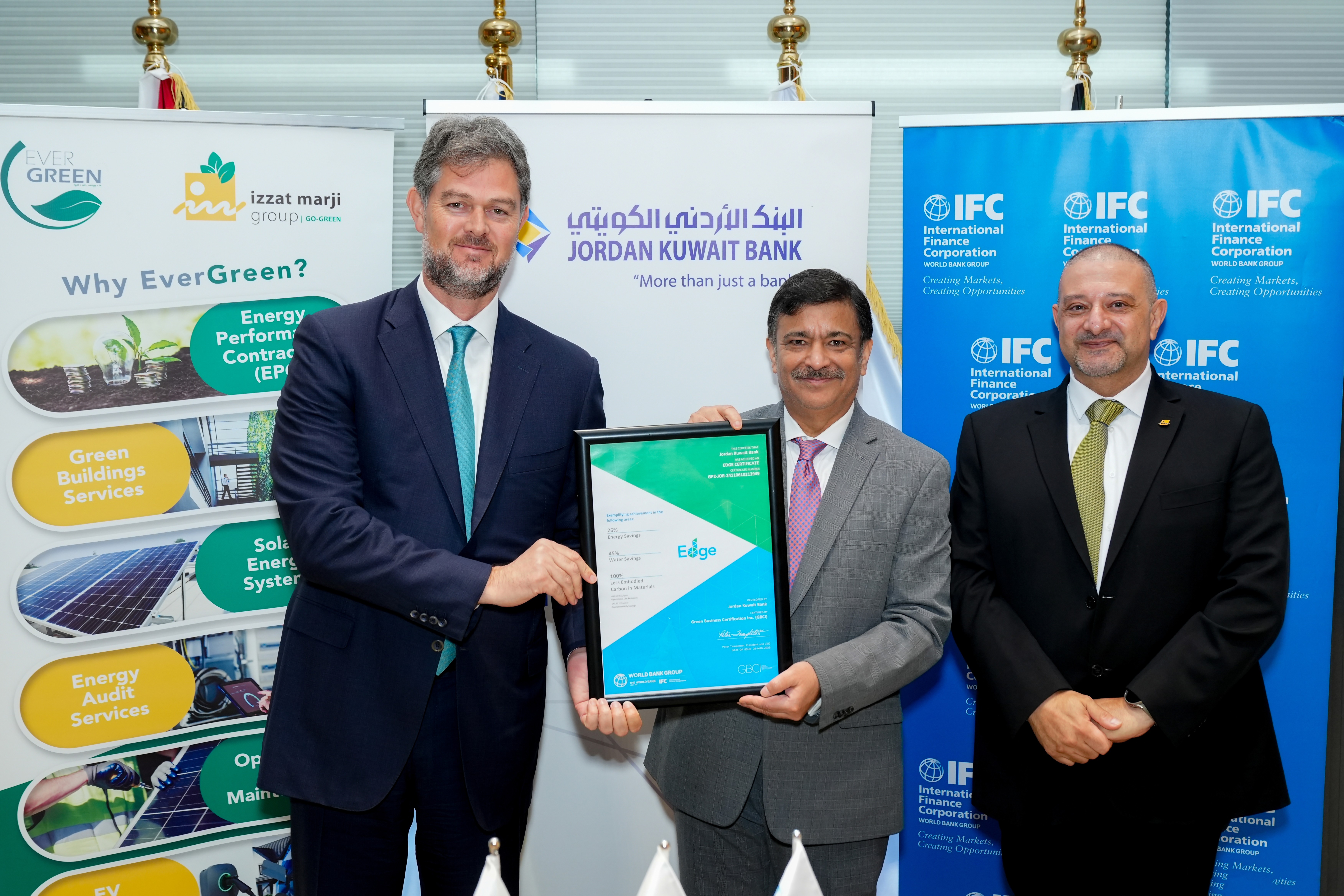 البنك الأردني الكويتي أول بنك في المملكة يحصل على شهادة "إيدج" للأبنية الخضراء من مؤسسة التمويل الدولية