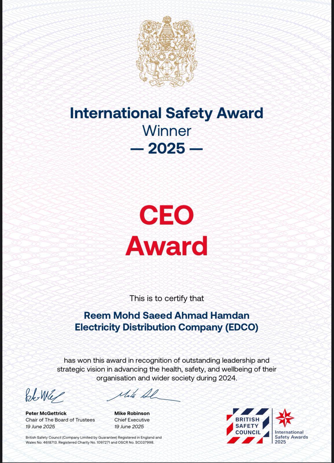 مدير عام "توزيع الكهرباء" تحصد جائزة الرئيس التنفيذي لعام 2025 من المجلس البريطاني للسلامة الدولية