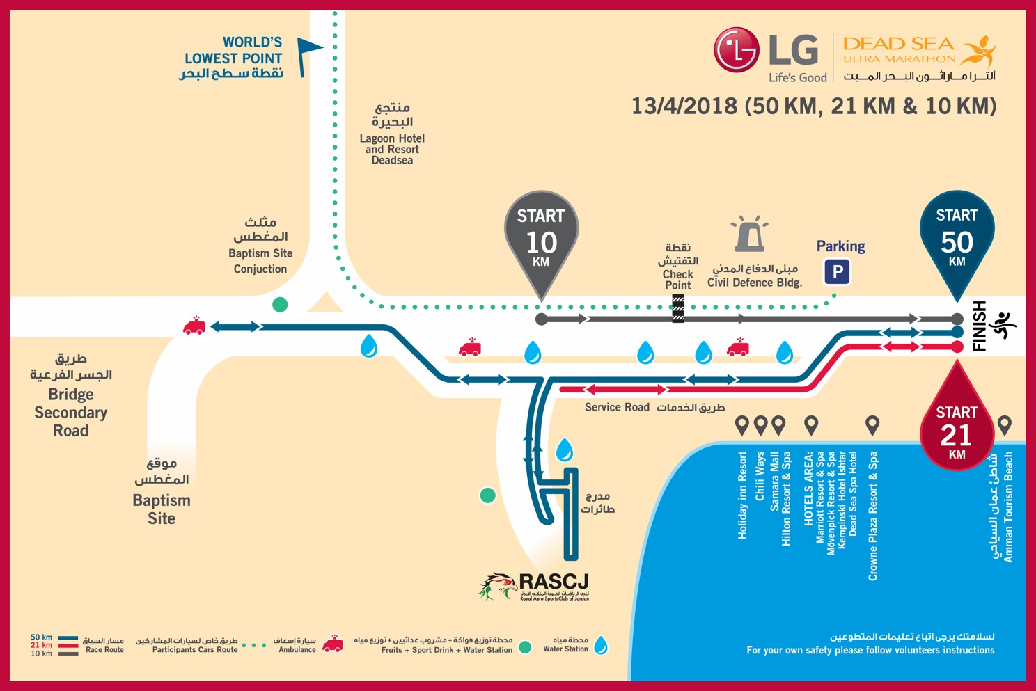 إغلاقات وتحويلات في عدد من شوارع البحر الميت يوم الجمعة تزامناً مع إطلاق "إل جي ألتراماراثون البحر الميت" 2018