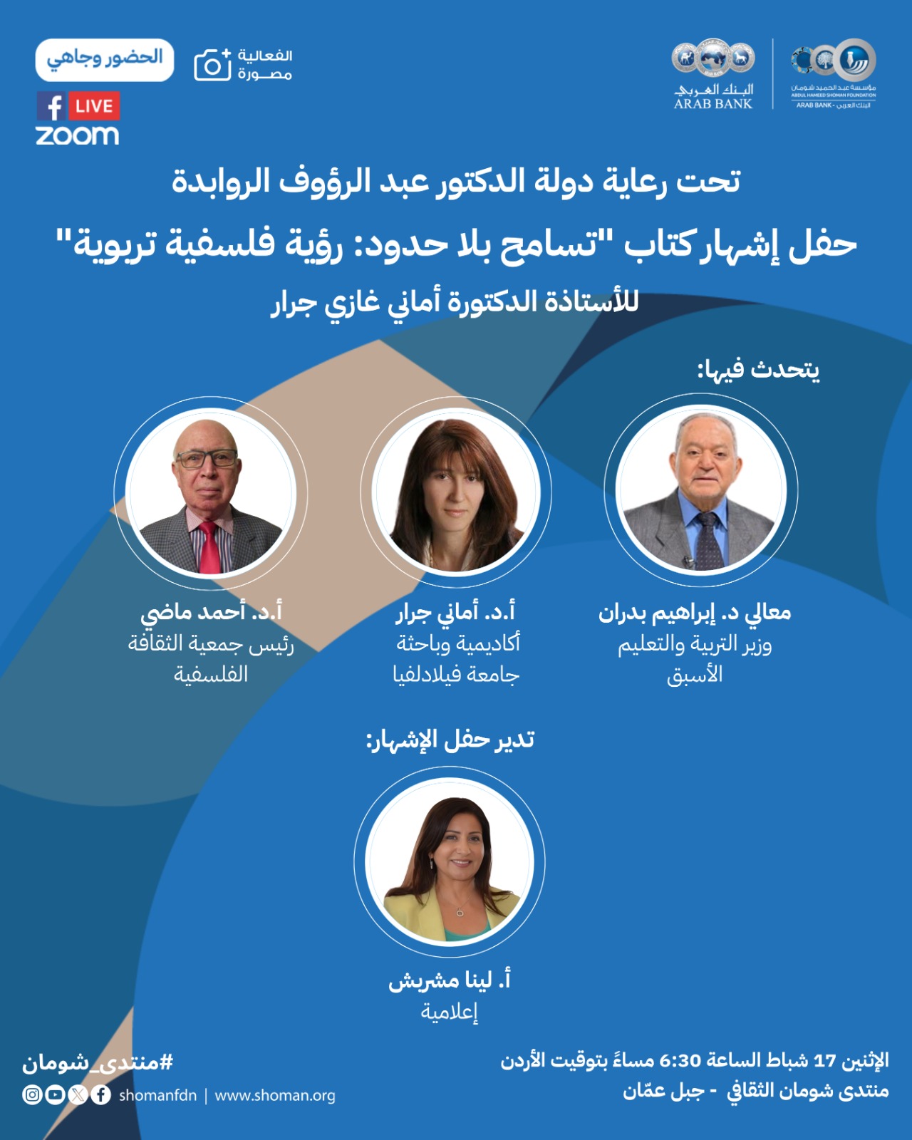 حفل إشهار كتاب "تسامح بلا حدود أ.د اماني غازي جرار يوم الاثنين المقبل