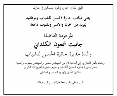 مكتب جائزة الحسن للشباب وموظفيه ينعون بمزيدالمرحومة الفاضلة جانيت شمعون الكلداني