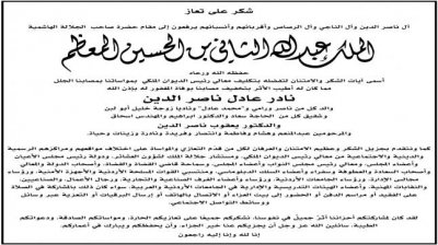 شكر على تعزية إلى مقام حضرة صاحب الجلالة الملك عبدالله الثاني ابن الحسين حفظه الله ورعاه