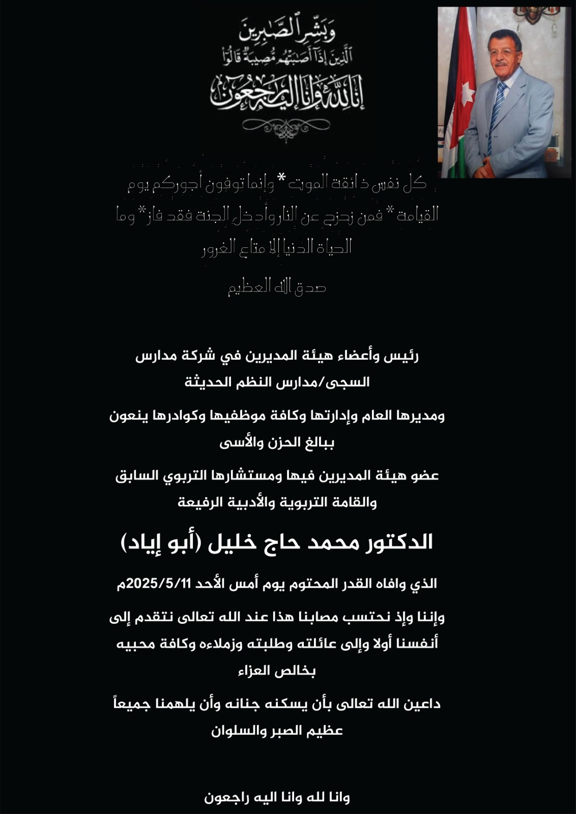 د. محمد حاج خليل ابو ايادعضو هيئة المديرين في مدارس النظم في ذمة الله ..