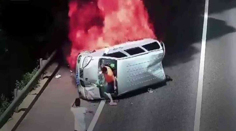 سيارة تنقلب وتحترق وركابها ينجون بأعجوبة …. شاهد الفيديو