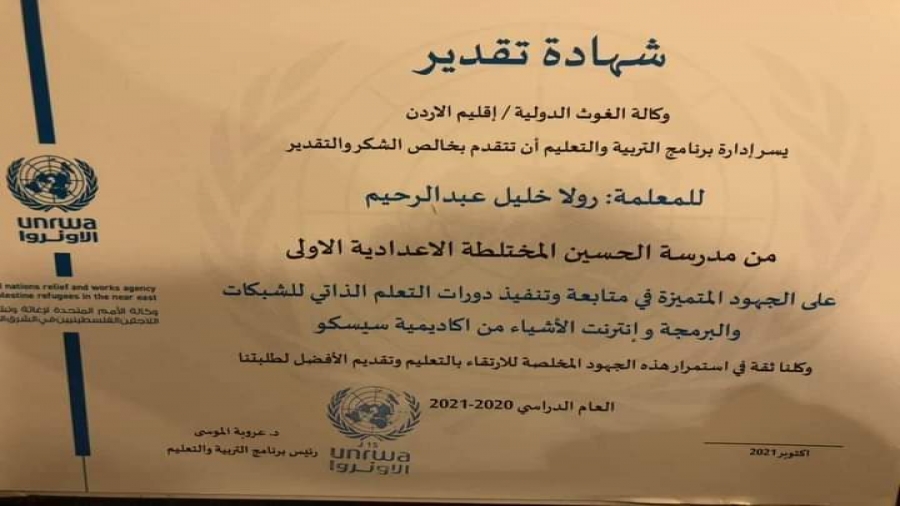إدارة برنامج التربية والتعليم (الأونروا )تكرم المعلمة رولا خليل عبد الرحيم عليان لتميزها