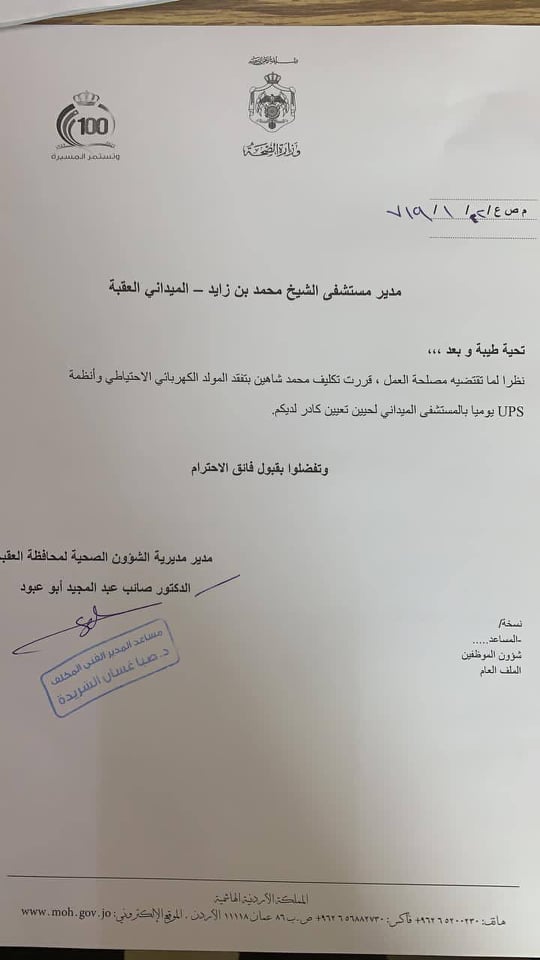 تكليف "سائق" لتفقد المولد الكهربائي وانظمة " ups " في المستشفى الميداني بالعقبة