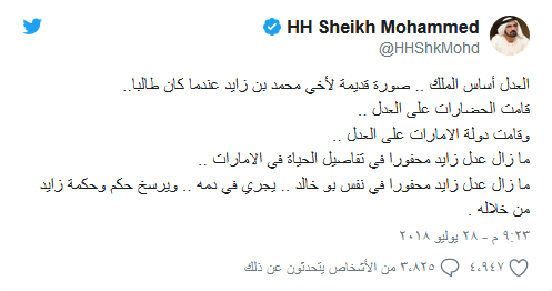 أنباء الوطن - نشر حاكم دبي، الشيخ محمد بن راشد آل مكتوم، السبت، صورة نادرة لولي عهد أبوظبي، الشيخ محمد بن زايد آل نهيان، عندما كان طالبا وهو يكتب على "السبورة" اللوح المدرسي "العدل أساس الملك".وعلق حاكم دبي على الصورة المنشورة على موقع تويتر: "العدل أساس الملك.. صورة قديمة لأخي محمد بن زايد عندما كان طالبا.. قامت الحضارات على العدل.. وقامت دولة الامارات على العدل.. ما زال عدل زايد محفورا في تفاصيل الحياة في الإمارات.. ما زال عدل زايد محفورا في نفس بو خالد.. يجري في دمه.. ويرسخ حكم وحكمة زايد من خلاله "