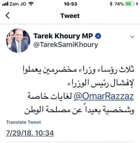 أنباء الوطن - غرد النائب طارق خوري صباح الوم عبر حسابه الخاص على موقع التواصل الاجتماعي " تويتر " تغريدة قال فيها بان هناك ثلاث رؤساء وزراء مخضرمين يعلموا لافشال رئيس الوزراء الدكتور عمر الرزاز .