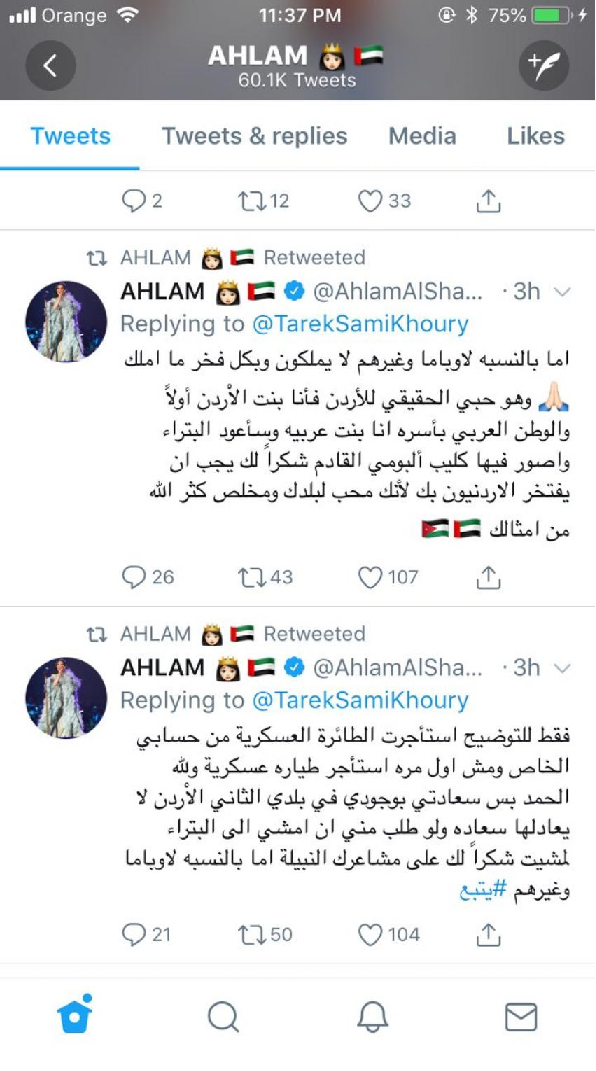 أنباء الوطن - وأكدت في ردها على تغريدة للنائب طارق خوري 'بس سعادتي بوجودي في بلدي الثاني الاْردن لا يعادلها سعادة، ولو طلب مني أن امشي الى البتراء لمشيت شكراً لك على مشاعرك النبيلة'.واضافت في تغريدة ثانية 'أما بالنسبة لاوباما (الرئيس الأمريكي السابق) وغيرهم لا يملكون وبكل فخر ما املك، وهو حبي الحقيقي للأردن فأنا بنت الاْردن أولاً والوطن العربي بأسره، أنا بنت عربية'.كما تعهدت الفنان احلام بتصوير البومها المقبل في البترا قائلة: 'سأعود البتراء واصور فيها كليب ألبومي القادم، شكراً لك يجب أن يفتخر الاردنيون بك لأنك محب لبلدك ومخلص كثر الله من امثالك'، مؤكدة على أنها لم تبدأ حملتها بعد للترويج إلى البترا وقالت 'ستشاهدون الفرق بإذن الله'.