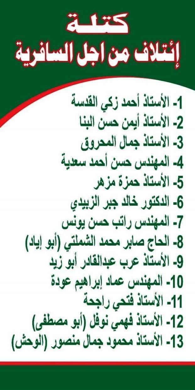 ويلاقي المرشح الابرز الدكتور خالد الزبيدي شبه اجماع في صفوف ابناء السافرية نظرا لانجازاته في مجال العمل الاجتماعي الذي راكمه على مدى سنوات قدم خلالها خدمات متنوعة للجمعية ولاعضاء هيئتها العامة بالاضافة الى نشاطاته الاقتصادية في الاردن وفلسطين .