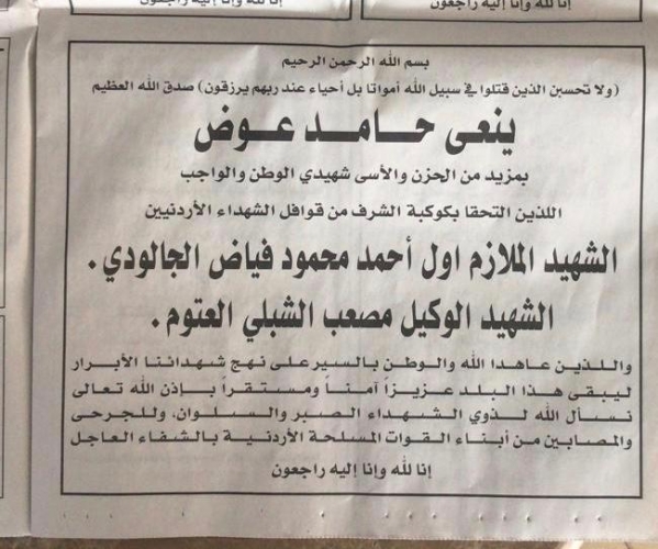 أنباء الوطن - ينعى حامد عوض بمزيد من الحزن والأسى شهيدي الوطن والواجباللذين التحقا بكوكبة الشرف من قوافل الشهداء الأردنيين: الشهيد الملازم اول أحمد محمود فياض الجالودي، والشهيد الرقيب اول مصعب الشبلي العتوم، اللذان عاهدا الله والوطن بالسير على نهج شهدائنا الأبرار ليبقى هذا البلد عزيزاً آمناً ومستقراً بإذن الله تعالى .