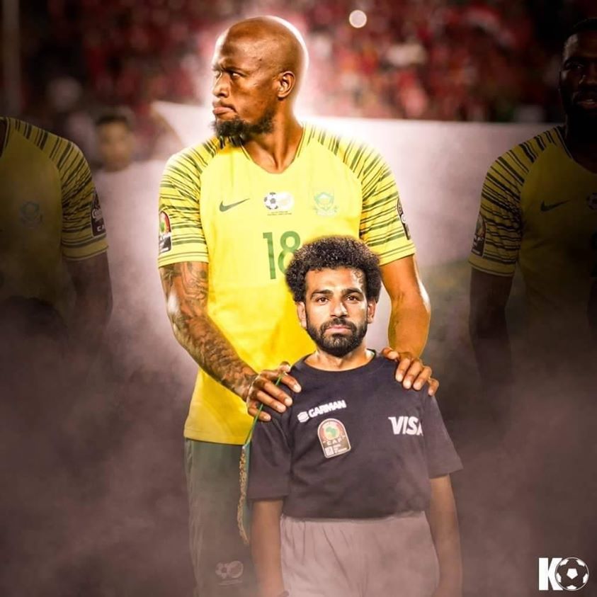 وأظهرت الصورة صلاح المحترف في صفوف ليفربول، على هيئة طفل بعد تعديلها ببرنامج "الفوتوشوب" وهو يقف أمام مدافع منتخب جنوب إفريقيا مالومي هالانتي.