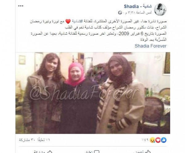 الصورة نشرتها إحدى الصفحات المحبة لشادية عبر موقع "فيسبوك"، وتزره فيها الفنانة الراحلة بحجابها إلى جانب نورة ونيرة رمضان الشراح، بنات الدكتور رمضان الشراح مؤلف كتاب "شادية نغم في القلب".