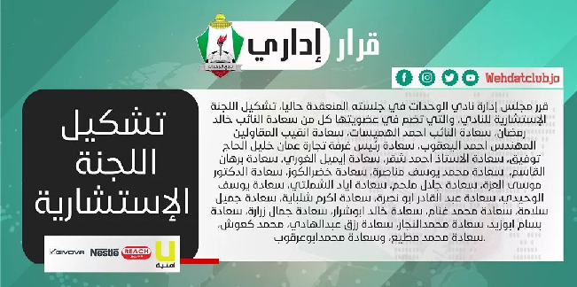 أنباء الوطن - قررت الهيئة الادارية لنادي الوحدات تشكيل اللجنة الاستشارية للنادي تضم قامات نيابية واقتصادية واعلامية ورياضية وثقافية ، من بينهم الزميل محمد غنام رئيس التحرير المسؤول ، وفيما يلي القرار :