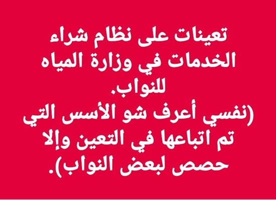 وقال الحباشنة : "تعيينات على نظام شراء الخدمات في وزارة المياه للنواب".