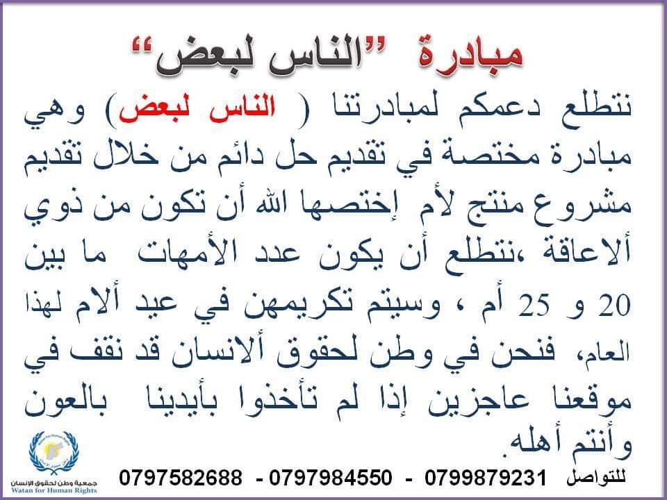 أنباء الوطن - الدكتوره رلى الحروب الرئيسة الفخرية لجمعية "وطن ". تطلق مبادرة الناس لبعض و جمعية وطن لحقوق الإنسان و منظمة غير حكومية مسجلة رسمياً منذ عام 2012 لا تهدف إلى الربح، أسسها عدد من نشطاء حقوق الانسان لهم خبرة منذ بداية عام 2000 من أجل دعم وتعزيز حقوق الإنسان وحرياته الأساسية ومبادئ الديمقراطية واحترامها. كما تعمل على دراسة ومراجعة التشريعات المتعلقة بها بشكل يؤدي إلى توفير ضمانات أكبر للفرد وخلق وعي أكثر لديه،ومن الجذير بالذكر أن الجمعية الآن اطلقلت هاشتاغ #الناس_لبعض والمبادرة تهدف لتحسين الظروف المعيشية للأمهات من ذوي الاحتياجات الخاصة وهي أول مبادرة في الأردن من النوع المميز وتعنى بالأم من ذوي الإعاقة وتهدف تقديم مشروع بيتي مستدام للأسرة . وتتطلع جمعية وطن لدعمها لتحقق إحدى اهدافها واهمها وهو الحق في الحياة الكريمة للأسر من ذوي الإحتياجات الخاصة.