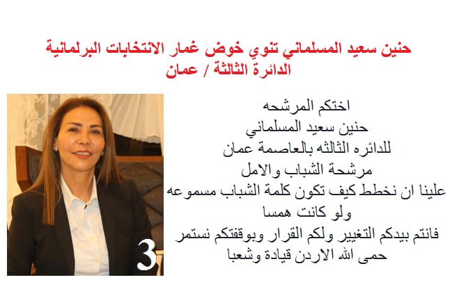 حنين المسلماني وينال سعد الدين ضمرة من كتلة الوحدة الوطنية إلى البرلمان عن الدائره الثالثة