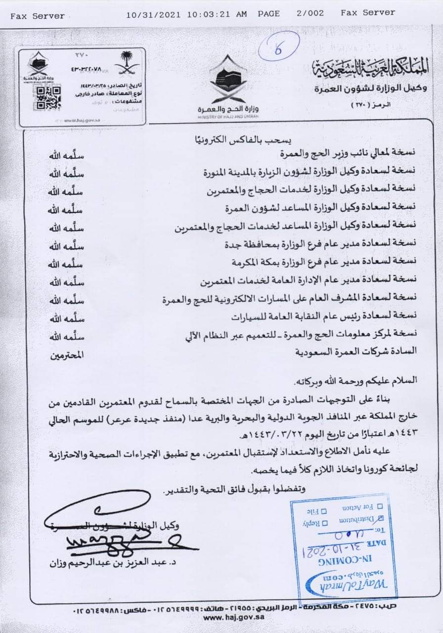 وقالت الوزارة، في تعميم لها ، إنه يسمح بقدوم المعتمرين من خارج المملكة، عبر المنافذ الجوية الدولية والبحرية والبرية، للموسم الحالي، اعتبارا من 22/3/1443 هـ.