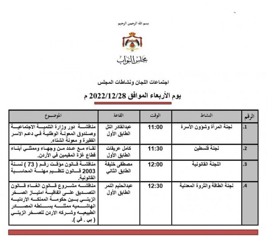 وتناقش اللجنة القانونية القانون المؤقت لقانون تنظيم مهنة المحاسبة القانونية، كما تناقش لجنة المرأة وشؤون الأسرة دور وزارة التنمية الاجتماعية وصندوق المعونة الوطنية في دعم الأسر الفقيرة ومعونة الشتاء.