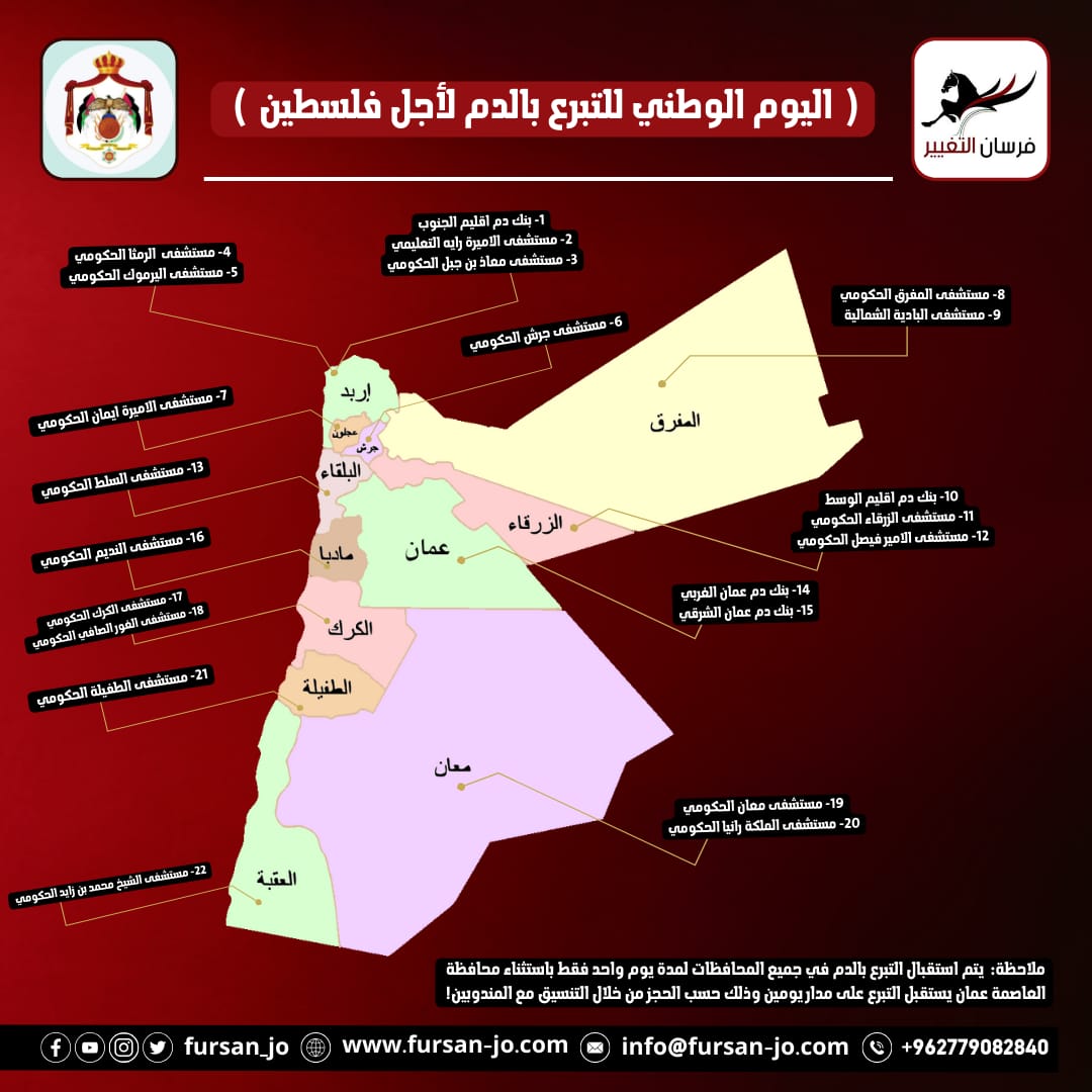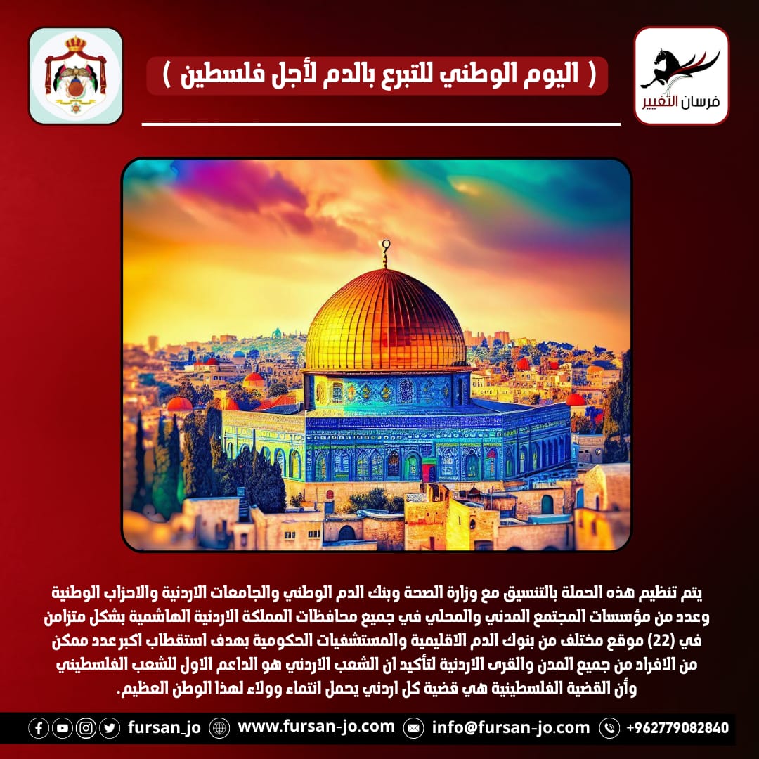 تنظم جمعية فرسان التغيير للتنمية السياسية وتطوير المجتمع المدني يوم وطني للتبرع بالدم لاجل فلسطين تحت شعار (دمنا دمكم) بالتنسيق مع وزارة الصحة وبنك الدم الوطني والجامعات الاردنية والاحزاب الوطنية وعدد من مؤسسات المجتمع المدني والمحلي.