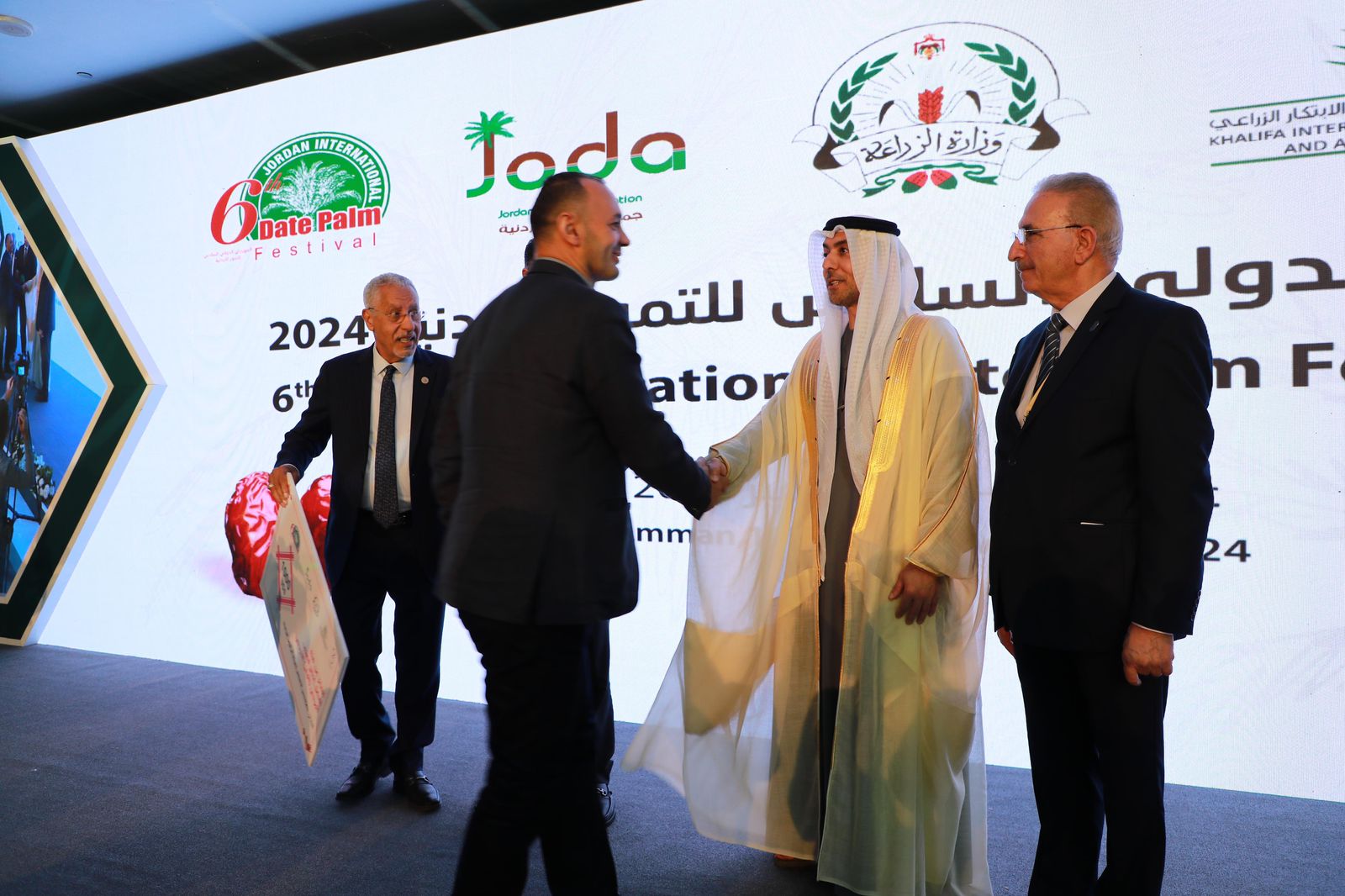 برعاية صاحب الجلالة الهاشمية الملك عبد الله الثاني ابن الحسين المعظم “حفظه الله” ملك المملكة الأردنية الهاشمية شهد معالي المهندس خالد الحنيفات مندوب راعي المهرجان، وزير الزراعة الأردني، وبحضور سعادة الأستاذ حمد عبد الله المطروشي القائم بأعمال سفارة دولة الإمارات العربية المتحدة بعمّان، والدكتور عبد الوهاب زايد أمين عام جائزة خليفة الدولية لنخيل التمر والابتكار الزراعي، افتتاح المهرجان الدولي السادس للتمور الأردنية الذي تنظمه الأمانة العامة للجائزة بالتعاون مع وزارة الزراعة الأردنية وجمعية التمور الأردنية، كما شهد حفل الافتتاح عدد من ممثلي المنظمات الدولية وأعضاء السلك الدبلوماسي المقيم في الأردن وحشد كبير من الباحثين وأصحاب المزارع ومنتجي التمور والشركات في المملكة الأردنية الهاشمية.