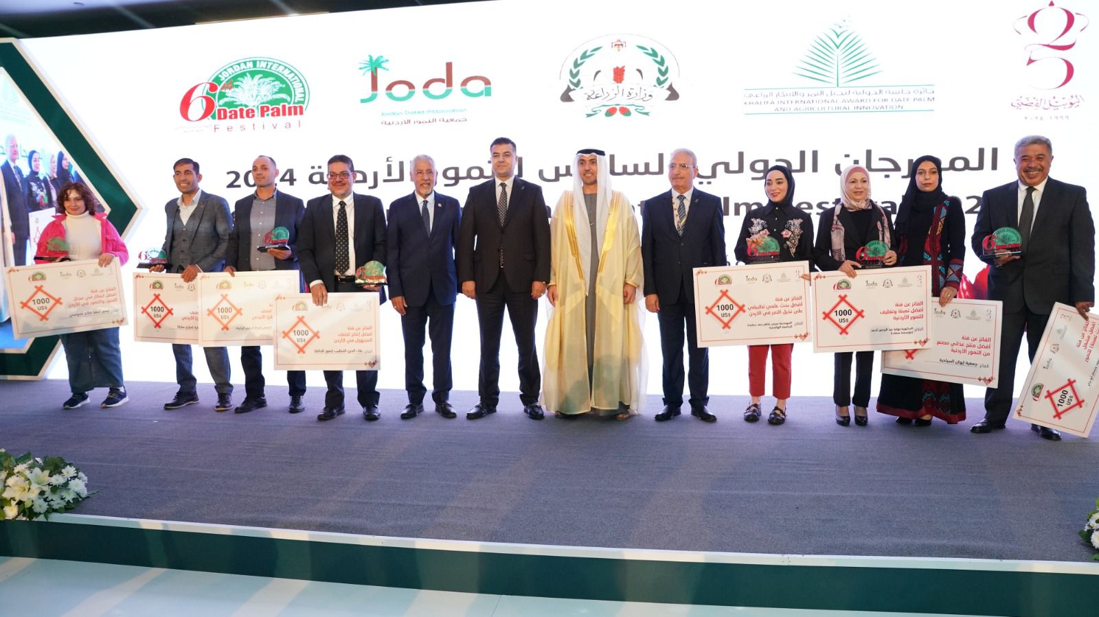 كما قام معالي المهندس خالد الحنيفات مندوب راعي المهرجان جلالة الملك عبد الله الثاني “حفظه الله” وزير الزراعة، وسعادة الأستاذ حمد عبد الله المطروشي القائم بالأعمال بسفارة دولة الإمارات العربية المتحدة بعمان، والدكتور عبد الوهاب زايد أمين عام جائزة خليفة الدولية لنخيل ا لتمر والابتكار الزراعي، والمهندس أنور حداد رئيس جمعية التمور الأردنية، بتكريم الفائزين بمسابقة التمور الأردنية في دورتها السادسة 2024 وكانت النتائج على النحو التالي: