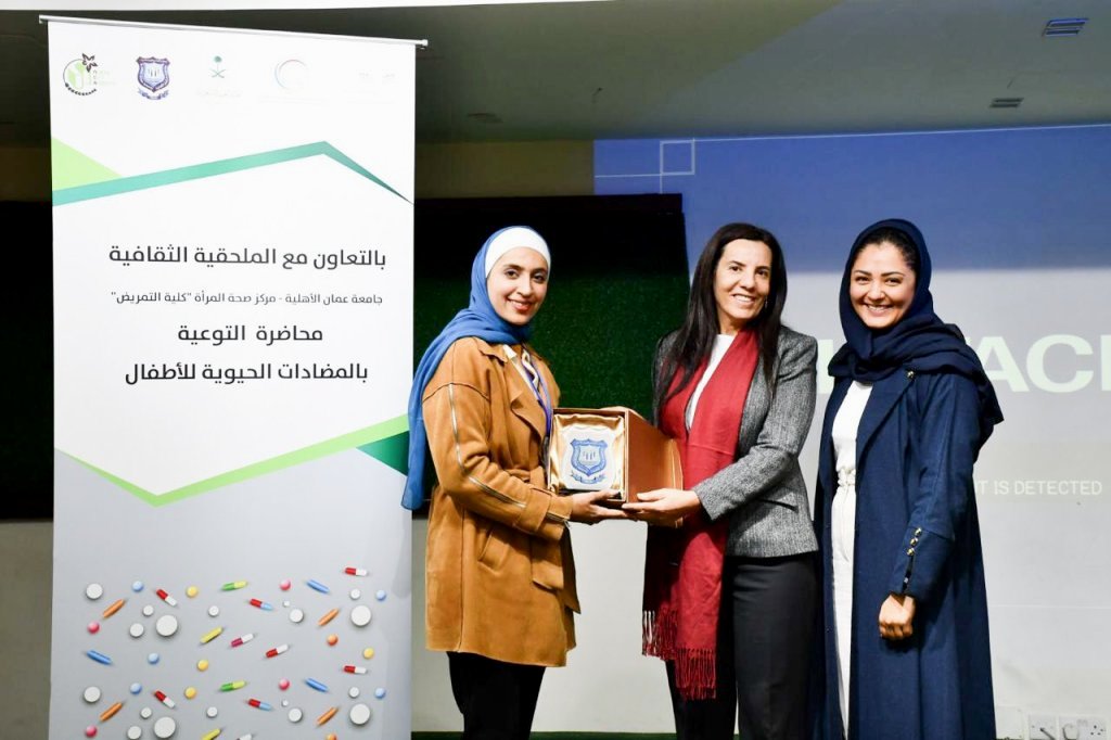 في إطار جهود مركز صحة المرأة التابع لكلية التمريض في جامعة عمان الأهلية لتعزيز التوعية الصحية بين أفراد المجتمع، وبتنظيم مشترك مع الملحقية الثقافية السعودية لدى الأردن، قدمت الصيدلانية حنين المومني محاضرة توعوية بعنوان "المضادات الحيوية وآثارها على الأطفال" في أكاديمية نورث سيتي.