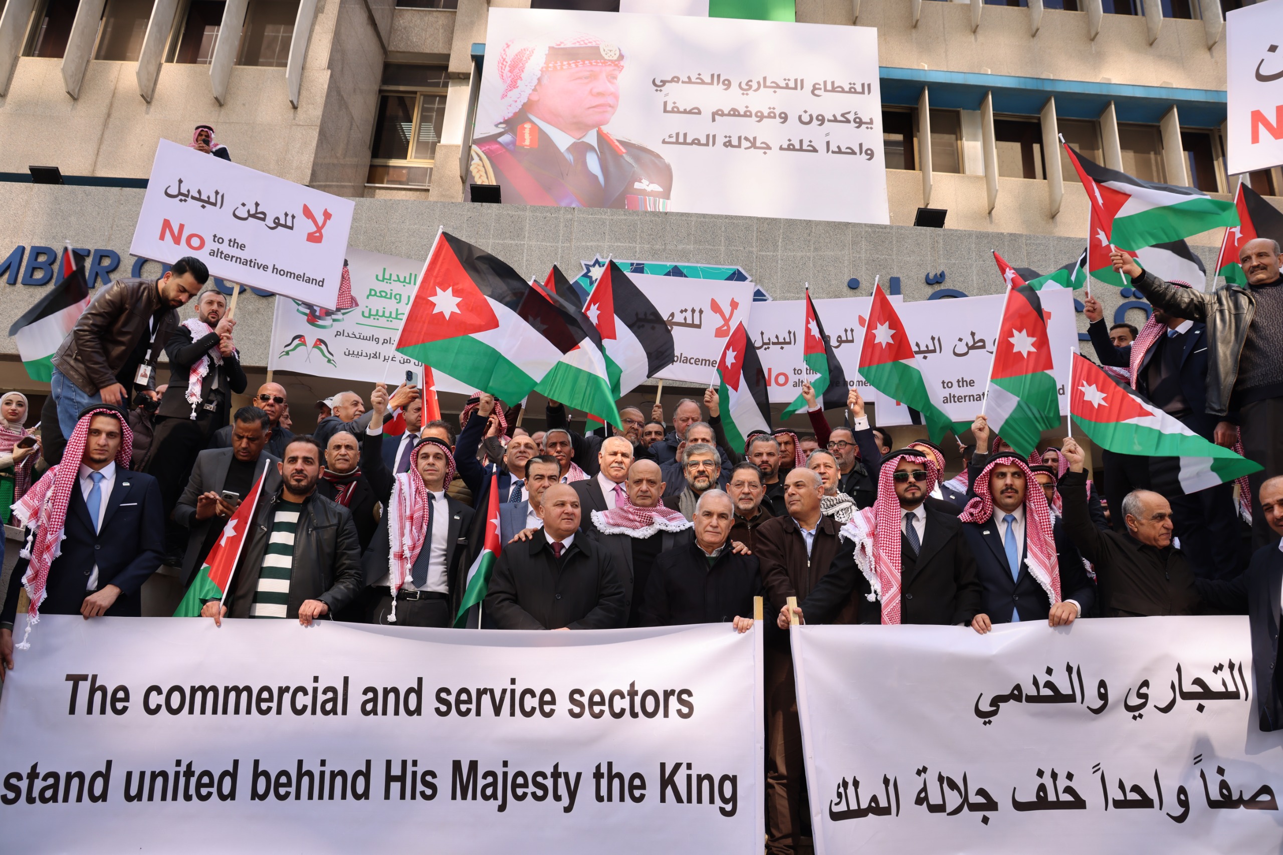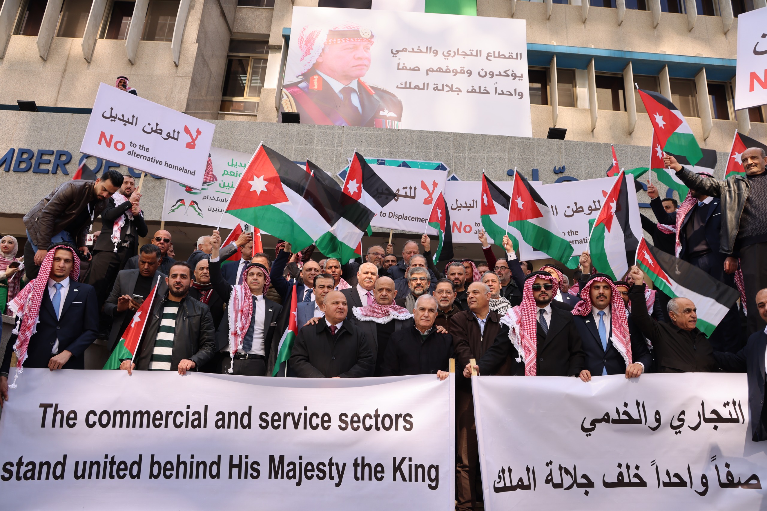 وشارك بالوقفة التي تخللها رفع الإعلام الأردنية وشعارات تؤكد الرفض التام للتهجير والتوطين والوطن البديل، وتؤكد الوقوف خلف القيادة الهاشمية، رؤساء غرف تجارية وممثلو القطاعات التجارية ورؤساء نقابات وجمعيات أصحاب العمل وأصحاب أعمال وشركات.