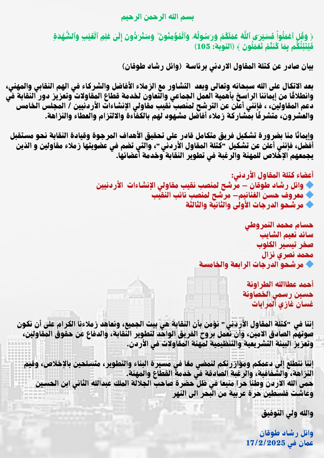 يبدو أن كتلة “المقاول الأردني” قد نجحت في استقطاب اهتمام ومساندة شريحة واسعة من المقاولين، وهو ما يعكس رغبة حقيقية في التغيير، وإعادة بناء نقابة قوية تدافع عن حقوق أعضائها وتسهم في تطوير قطاع الإنشاءات في الأردن
