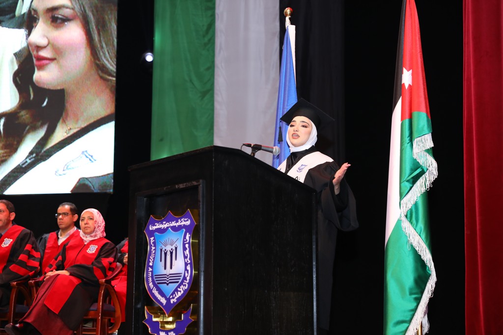 ثم ألقت الطالبة الخريجة سوار بسام البقور- خريجة كلية الصيدلة بتقدير امتياز- كلمة الخريجين قالت فيها : ومن جامعةِ عمانَ الأهليةِ نهتفُ: يا هناء، كلُّ من فيها أو إليها قلبُهُ يميلُ.والحمد لله الذي بنعمته تتم الصالحات، وبتوفيقه يسَّر لنا أمرنا، وبفضله أقف الآن أمامكم خريجة.