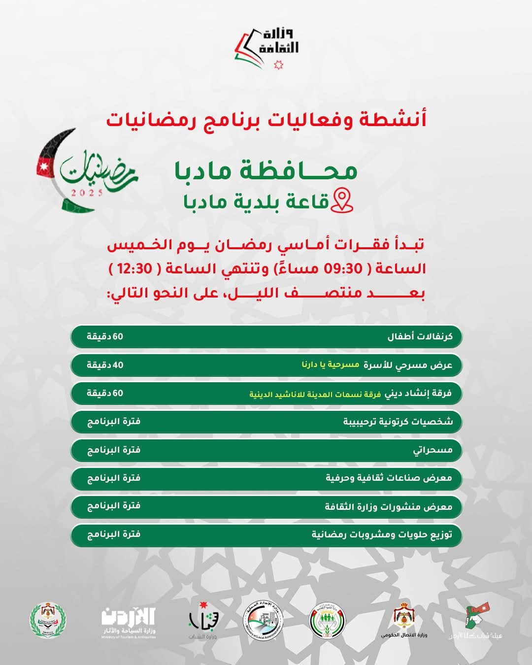 أنباء الوطن - دعت وزارة الثقافة الأردنية المواطنين في العاصمة عمان المشاركة والحضور فعاليات "رمضانيات ٢٠٢٥" التي تنطلق اليوم الخميس في المركز الثقافي الملكي. وأدرجت الوزارة دعوتها عبر صفحها الرسمية على الفيسبوك قالت فيها "الأحبة في العاصمة عمان ندعوكم لحضور فعاليات" رمضانيات ٢٠٢٥ غدا الخميس في المركز الثقافي الملكي وفعاليات فنية وأدبية لكل أفراد العائلة. وتشمل الفعاليات شخصيات كرتونية وكرنفالات للأطفال، وعروضا مسرحية ومسابقات يتخللها توزيع حلويات ومشروبات رمضانية. ونوهت إلى أن الدخول مجاني .