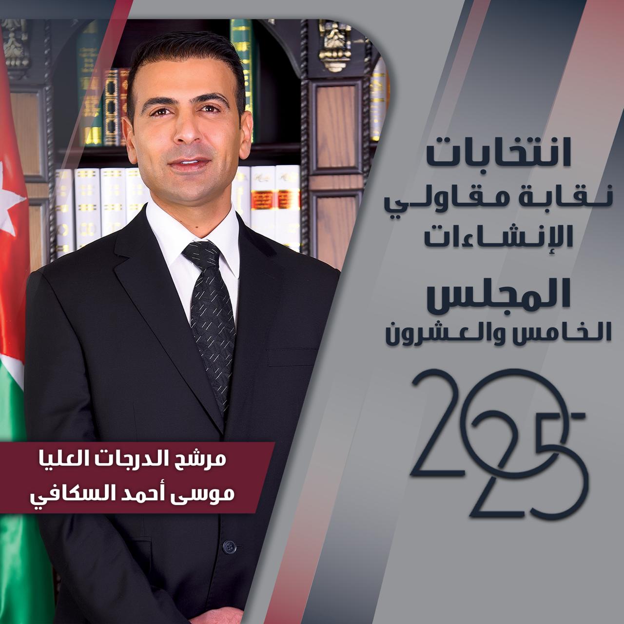 أعلن الشاب الأردني الطموح موسى أحمد السكافي عن خوضه انتخابات نقابة مقاولي الإنشاءات الأردنيين، مرشحًا مستقلًا عن مقعد الفئات العليا، مؤكدًا أن قراره جاء بعد دراسة متأنية واستشارة زملائه من الهيئة العامة، وإيمانًا منه بضرورة النهوض بقطاع المقاولات لمواجهة التحديات التي تعترضه.