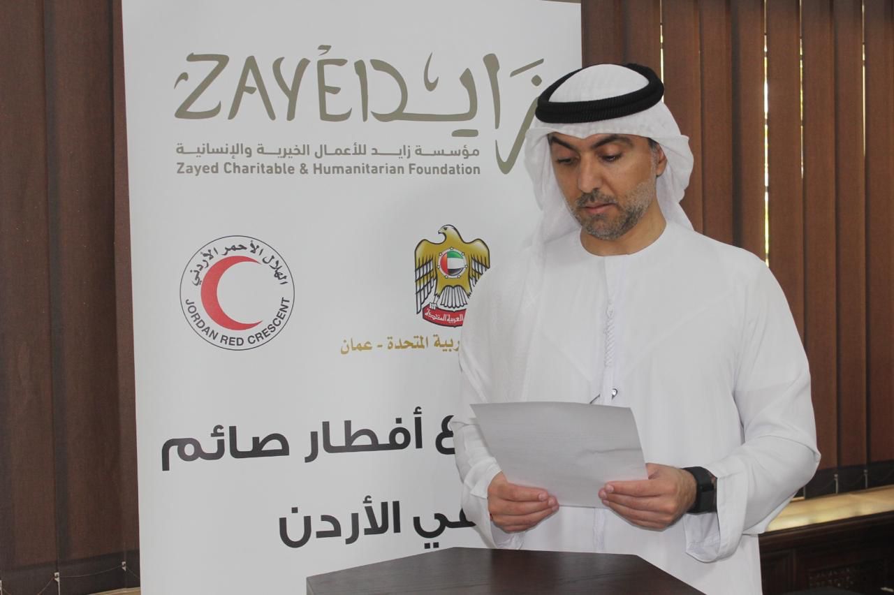 وأشرف على الإفطار وفد مؤسسة زايد الإنسانية، حيث استفادت آلاف العائلات من مبادرات المؤسسة في تقديم وجبات إفطار للأسر المستحقة والأيتام واللاجئين في العديد من محافظات المملكة منها منطقة الأغوار الجنوبية في محافظة الكرك، ومنطقة سحاب وجبل الزهور التابعتين للعاصمة عمان وغيرها من المناطق، إضافة إلى تنظيم الإفطار الجماعي للصائمين في مركز زها الثقافي شرقي العاصمة عمّان.
