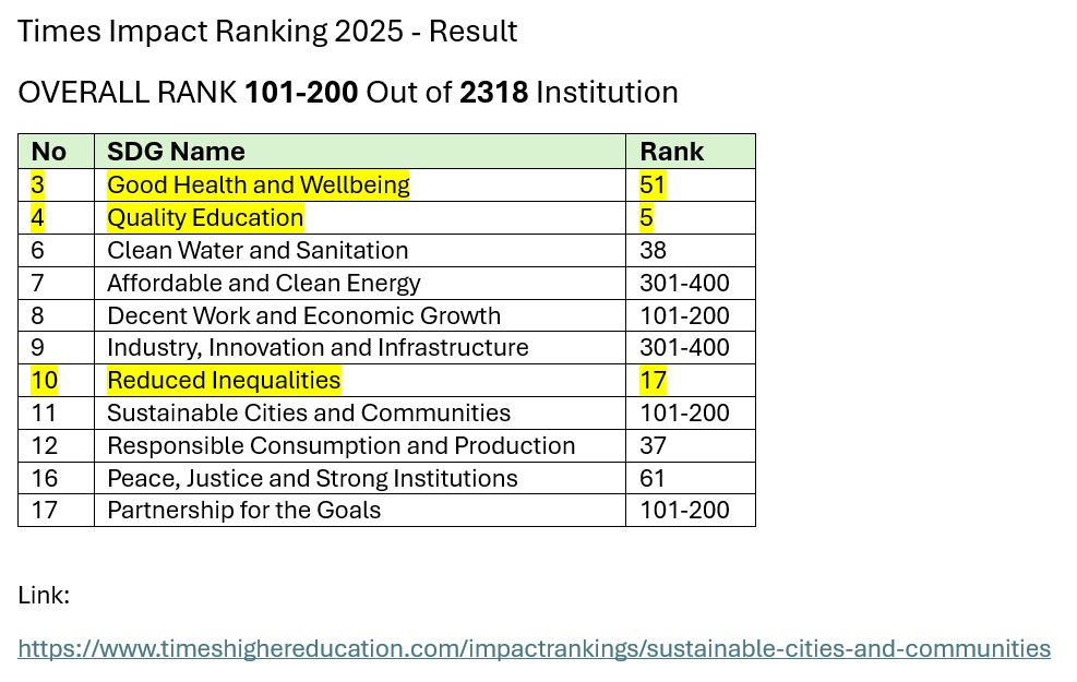 وقد تميّزت الجامعة بنتائج استثنائية في عدد من أهداف التنمية المستدامة، أبرزها: الهدف الرابع: التعليم الجيد، حيث حصلت الجامعة على المرتبة الخامسة على مستوى العالم، وهو إنجاز يُعدّ من الأعلى دولياً ويعكس جودة البرامج الأكاديمية وشمولية التعليم، والهدف العاشر: الحد من أوجه عدم المساواة، إذ جاءت الجامعة في المرتبة السابعة عشرة عالمياً، تأكيداً على التزامها بتحقيق العدالة الاجتماعية وإتاحة الفرص التعليمية للجميع، والهدف الثالث: الصحة الجيدة والرفاه، محققة المرتبة الحادية والخمسين عالمياً بفضل مبادراتها المجتمعية وبرامجها الصحية الريادية، والهدف الثاني عشر: الإنتاج والاستهلاك المسؤولان، حيث احتلت المرتبة السابعة والثلاثين عالمياً، نتيجة سياساتها المستدامة في إدارة الموارد، والهدف السادس: المياه النظيفة والنظافة الصحية، بحصولها على المرتبة الثامنة والثلاثين عالمياً، انعكاساً لمشروعاتها في كفاءة استهلاك المياه والنظافة العامة، والهدف السادس عشر: السلام والعدل والمؤسسات القوية، محققة المرتبة الواحدة والستين عالمياً، مما يؤكد على تعزيز الشفافية وبناء مؤسسات تعليمية فعالة، وكما برزت الجامعة ضمن الفئة (101–200) على مستوى العالم في الهدف السابع عشر: عقد الشراكات لتحقيق الأهداف، تأكيداً على فاعلية تعاونها المحلي والدولي لخدمة التنمية المستدامة.