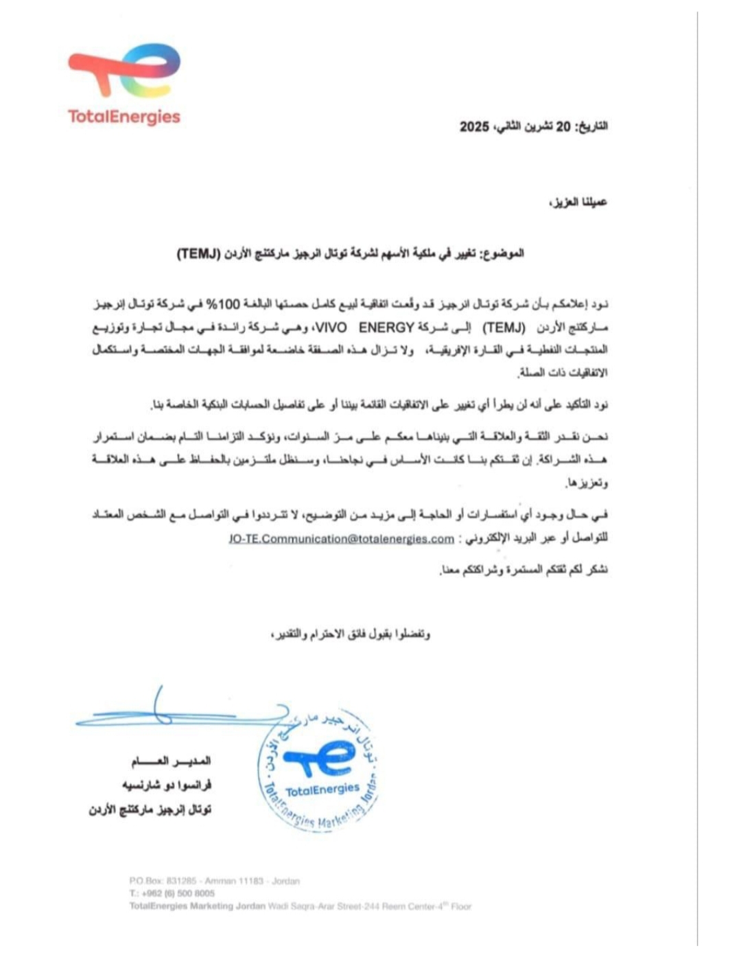 وثيقة تؤكد ان“توتال الأردن” تعلن بيع 100% من ملكيتها لشركة Vivo Energy الأفريقية (وثيقة)